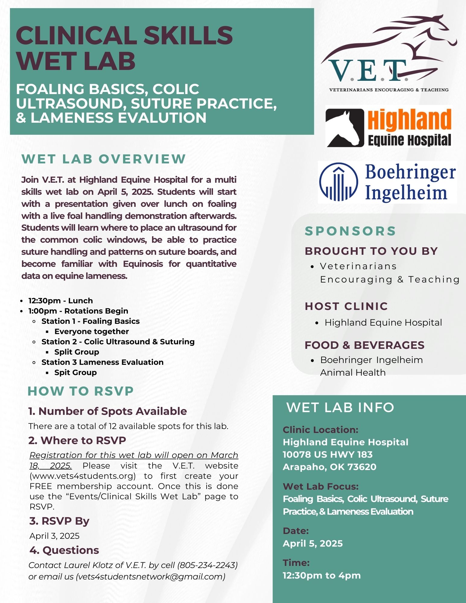 WET LAB OVERVIEW Join V.E.T. at Highland Equine Hospital on April 5, 2025, for a multi-skills wet lab featuring a foaling presentation, live foal handling, ultrasound placement for colic windows, suture practice, and Equinosis training for equine lameness. 12:30pm - Lunch 1:00pm - Rotations Begin Station 1 - Foaling Basics Everyone together Station 2 - […]