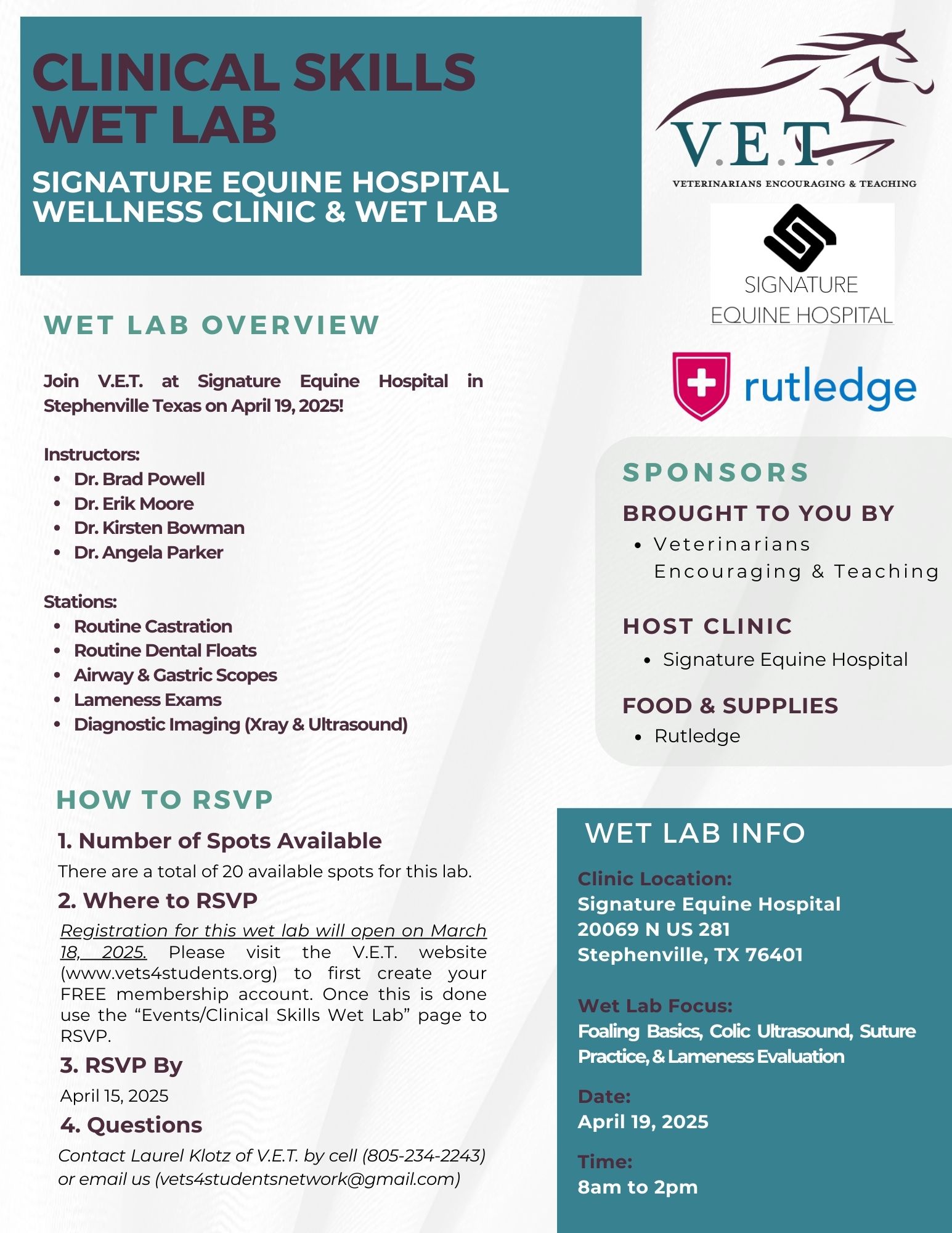 WET LAB OVERVIEW Join V.E.T. at Signature Equine Hospital in Stephenville Texas on April 19, 2025! Instructors: Dr. Brad Powell Dr. Erik Moore Dr. Kirsten Bowman Dr. Angela Parker Stations: Routine Castration Routine Dental Floats Airway & Gastric Scopes Lameness Exams Diagnostic Imaging (Xray & Ultrasound) Sponsors: V.E.T Signature Equine Hospital Rutledge V.E.T. - […]